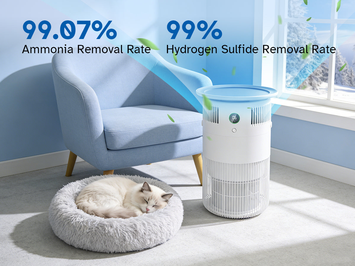 Yes. Unlike standard purifiers that just move air around, the P50 uses a dual-action system. An activated carbon filter captures the odor, while a photocatalytic layer destroys it at the molecular level. It’s designed specifically for "hot spots" like litter boxes, pet beds, and feeding areas to stop smells before they spread.