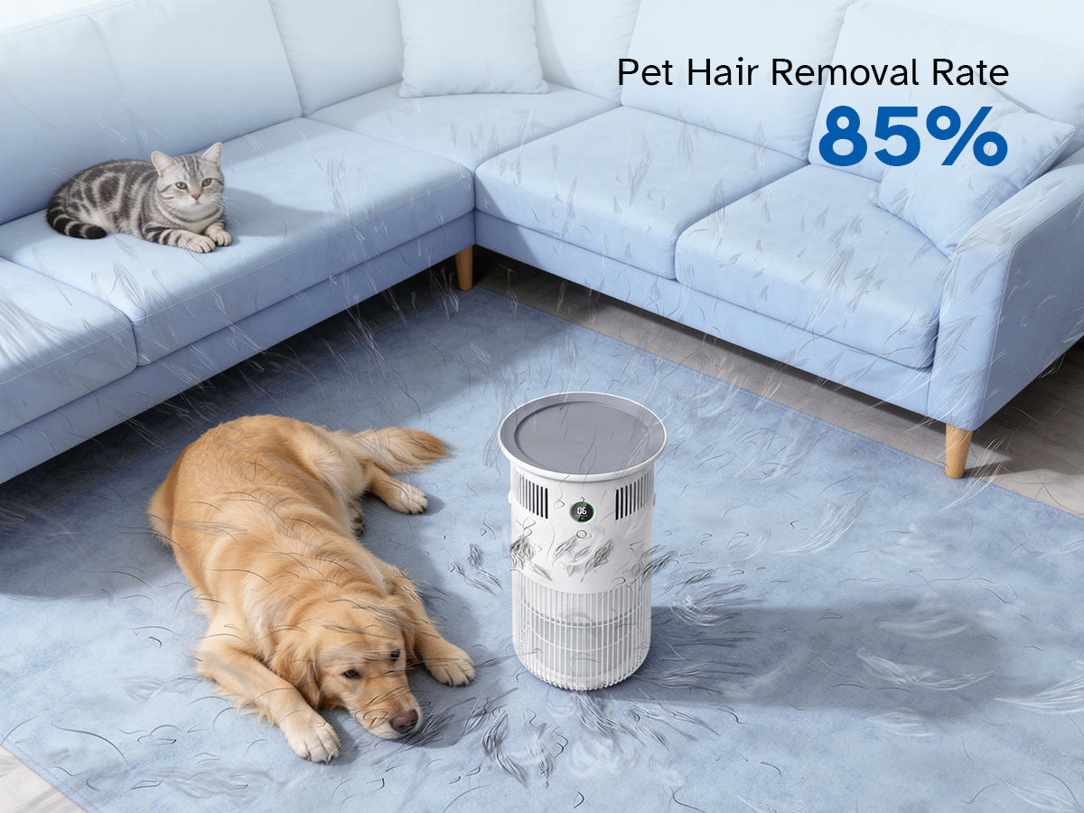 The P50 is designed to effectively refresh spaces up to 323 sq. ft., making it a wonderful fit for areas like bedrooms, home offices, or kitchens. While it can handle larger rooms, it truly shines when providing focused, high-intensity purification. In a typical setting, it gently circulates the air multiple times per hour to help neutralize odors and allergens as they arise. For the best experience, especially in homes with multiple pets, we suggest placing it near "odor zones" like litter boxes or pet beds to catch smells right where they start.